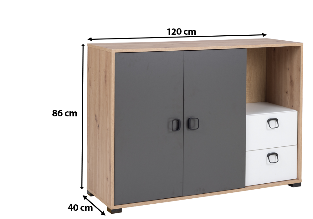 Junior Kommode CAMERUN verbindet modernes Design mit Funktionalität - die perfekte Ergänzung für jedes Jugendzimmer. Diese Kommode für das Jugendzimmer wurde mit Blick auf die Bedürfnisse der Jugendlichen von heute entworfen und bietet ihnen einen stilvollen und praktischen Ort, um ihre Kleidung und andere Gegenstände aufzubewahren. Die Kommode hat zwei Türen, hinter dem sich ein geräumiges Regal für Gegenstände wie Bettwäsche, Handtücher oder saisonale Artikel befindet. Mit einer Tür werden diese Elemente vor den Blicken der Gäste verborgen und der Raum bleibt aufgeräumt und ästhetisch ansprechend. Im unteren Teil der Kommode befinden sich zwei Schubladen, die in auf kugelgelagerten Schienen, zur Aufbewahrung von kleinen Accessoires wie Unterwäsche oder Socken. Die kugelgelagerten Schienen sorgen für ein sanftes und leises Öffnen und Schließen der Schubladen, was jeder Benutzer zu schätzen weiß. Kantenschutz mit ABS, die Verwendung der Konstruktion der Kommode gewährleistet ihre Langlebigkeit und Widerstandsfähigkeit gegen mechanische Beschädigungen. Dank ihres modernen Designs fügt sich diese jugendliche Kommode perfekt in jede Einrichtung ein und verleiht ihr Frische und Energie. Holen Sie sich diese einzigartige Jugendkommode ins Haus, die auch den Erwartungen der anspruchsvollsten Jugendlichen gerecht wird und Funktionalität mit attraktivem Design verbindet.