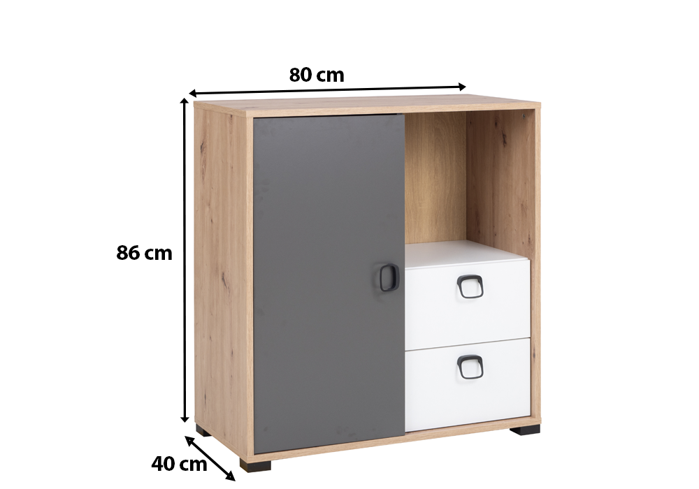 Junior Kommode CAMERUN verbindet modernes Design mit praktischen Lösungen - das perfekte Möbelstück für jedes Jugendzimmer. Die Kommode für das Jugendzimmer wurde mit Blick auf die Bedürfnisse der Jugend von heute entwickelt und bietet einen eleganten und funktionalen Platz für eine Vielzahl von Gegenständen. Die Kommode ist ausgestattet mit einer Tür auf der linken Seite, die einen geräumigen Stauraum für Kleidung, Bettzeug oder saisonale Accessoires verbergen. Diese Türen verbergen effektiv die gelagerten Gegenstände und halten den Raum ästhetisch ansprechend und aufgeräumt. Im unteren Teil des Möbels befinden sich zwei Schubladen auf kugelgelagerten Schienen, ideal für kleine Gegenstände wie Unterwäsche oder Schulsachen. Diese Schienen sorgen für einen reibungslosen und geräuscharmen Betrieb der Schubladen, der jeden Benutzer begeistern wird. Darüber hinaus verfügt die Kommode über eine offene Ebene, auf der Sie Ihre Lieblingsbücher, Gadgets oder Fotos ausstellen können. Diese offene Ebene macht die Kommode nicht nur zu einem funktionalen Möbelstück, sondern auch zu einem dekorativen Element des Jugendzimmers. Dank der Verwendung von Kantenschutz ABS, die Konstruktion der Kommode ist langlebig und widerstandsfähig gegen mechanische Beschädigungen. Darüber hinaus passt diese Jugendkommode mit ihrem modernen Design perfekt zu einer Vielzahl von Einrichtungsstilen und verleiht ihnen einen modernen und dynamischen Touch.