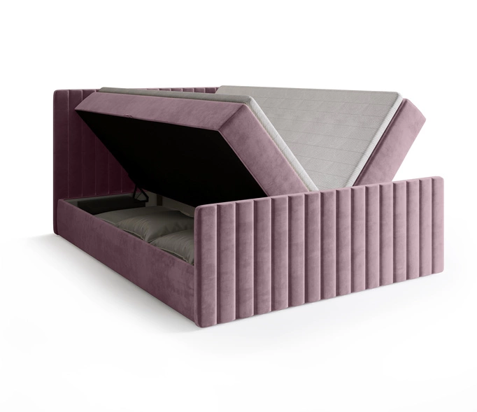 Kontinentales Bett DREAM DUO mit Abmessungen von 180x200 cm ist ein Vorschlag für diejenigen, die Komfort und elegantes Design des Schlafzimmers zu schätzen wissen. Die hohe, gepolsterte Kopfstütze mit dekorativem Muster schmückt nicht nur den Innenraum, sondern bietet auch bequemen Halt beim Ausruhen.