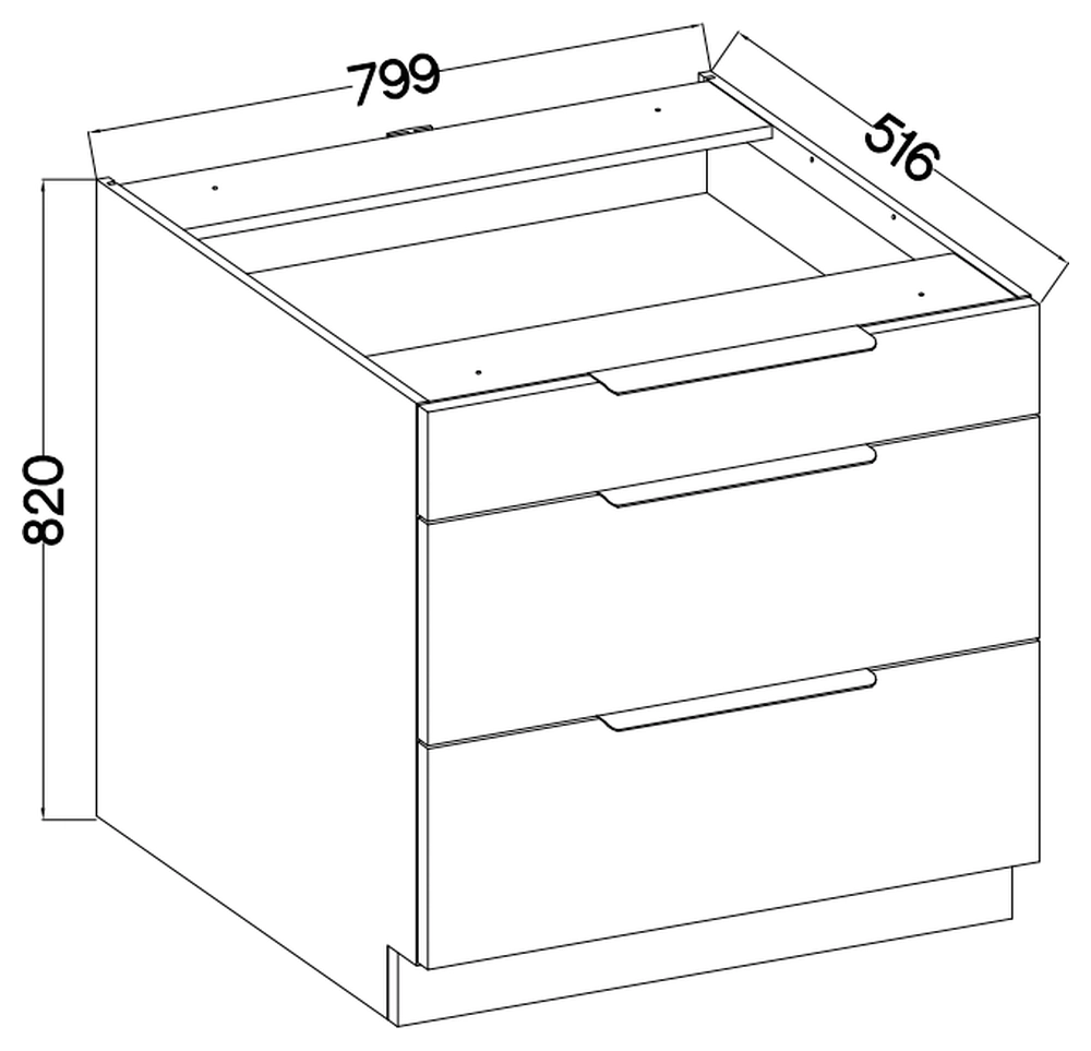 Der Schrank verfügt über  drei Schubladen , die eine geordnete Aufbewahrung verschiedener Küchenutensilien ermöglichen. Jede dieser Schubladen ist mit einem Soft-Close-System ausgestattet, wodurch sie sanft und ohne unnötige Geräusche oder Quietschgeräusche geöffnet und geschlossen werden können. Dies ist insbesondere dann nützlich, wenn Sie die Möbel nachts oder an einem Ort verwenden möchten, an dem Ruhe wichtig ist.