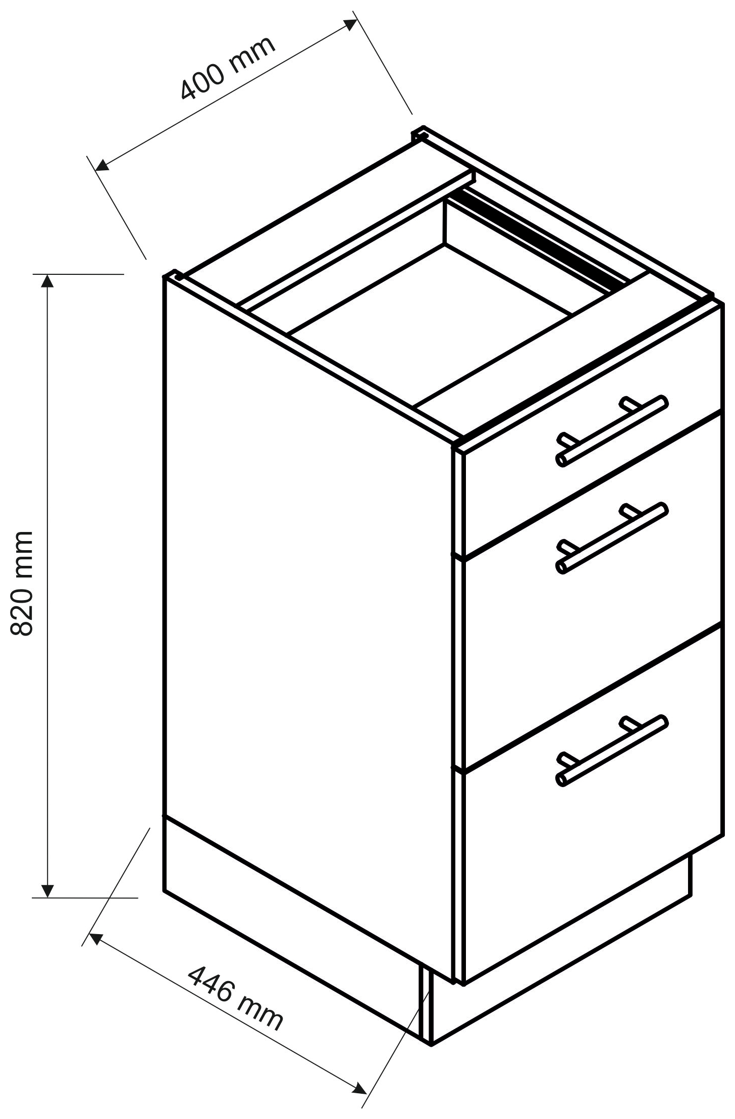 • Der Küchenschrank BRIT ist mit drei geräumigen Schubladen ausgestattet, die auf Schienen mit Dämpfern montiert sind. Die Front besteht aus MDF-Platte, während die Griffe aus Metall mit Chromoberfläche bestehen. Der Sockel ist im Set enthalten.