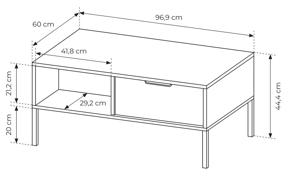 Entdecken Sie den modernen Couchtisch LECCE mit einem einzigartigen Design! Er hat zwei praktische Schubladen mit kugelgelagerten Schienen, eine öffnet sich nach vorne und die andere nach hinten für leichten Zugang und vollen Ausbau. Eleganter Korpus und Fronten in anthrazit, komplett mit goldenen Metallgriffen und dekorativem Goldfurnier ABS in der Mitte, einen Hauch von Chic und Raffinesse. Stabilität und Stil werden durch die 20 cm langen schwarzen Metallbeine gewährleistet. Die perfekte Ergänzung für Ihr Wohnzimmer, die Funktionalität mit Luxus verbindet.