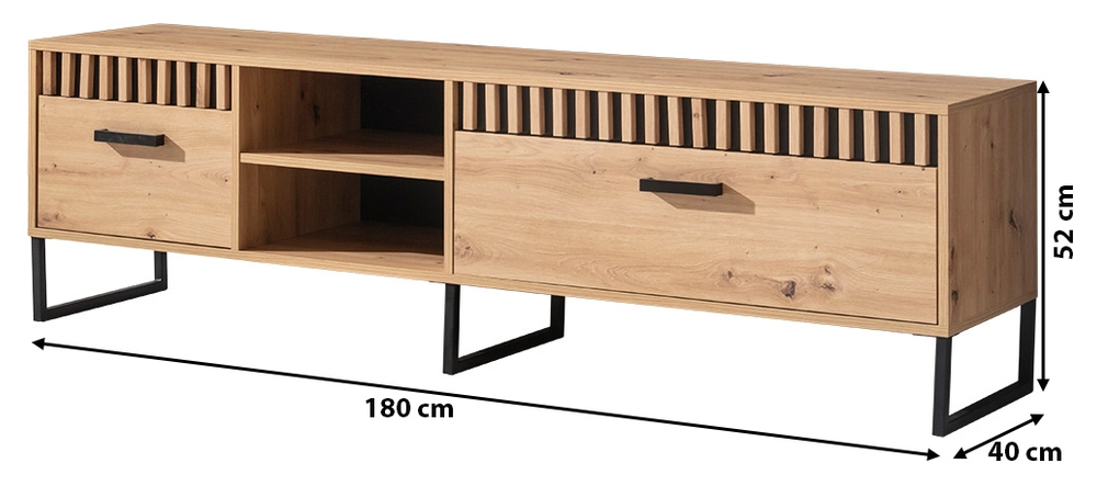 Der RTV-Schrank verfügt über zwei Schubladen mit leichtgängigen, kugelgelagerten Führungen, ideal für die Aufbewahrung kleinerer Gegenstände wie Fernbedienungen, Spiele oder Filme. Außerdem ist er mit einer offenen Ablage in der Mitte ausgestattet - ein idealer Platz für eine Set-Top-Box, Spielkonsole oder andere Multimedia-Geräte.
