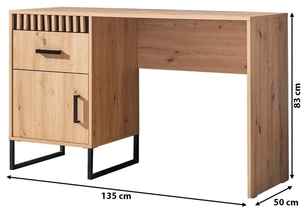Der Korpus des Schreibtisches ist hergestellt aus 16 mm laminierte Platte im Farbton Eiche artisan, das einen schönen Kontrast zu den schwarzen Details bildet. Diese Farbkomposition spiegelt den rauen Charakter des Loft-Stils wider und bringt gleichzeitig ein warmes, natürliches Element in Ihren Raum.
