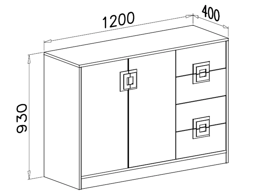 Kinderzimmerkommode aus der Kollektion NAMIKO ein 120 cm breiter Schrank mit vier Schubladen auf der rechten Seite, in denen Sie Ihre Kleidung oder Accessoires wie Socken unterbringen können. Hinter ein paar Türen finden wir zwei geräumige Ablagen für unsere Kleidung.