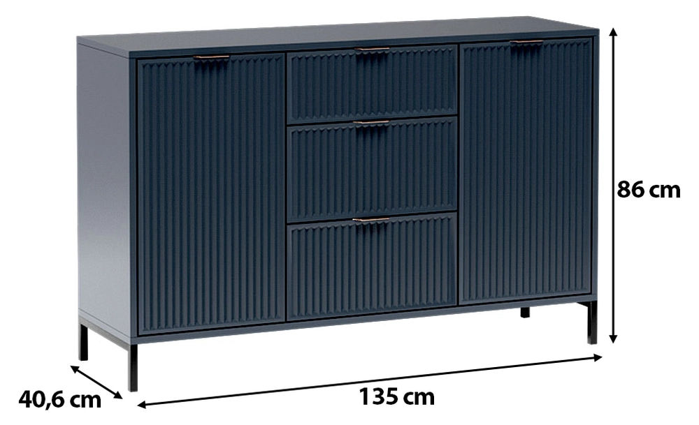 Kannelierte Kommodenfronten sind aus stabilem MDF mit einer Dicke von 18 mm, die perfekt zur Indigofarbe des Schranks passt. Diese raffinierte Ausführung verleiht der Kommode ein einzigartiges Aussehen und unterstreicht ihren modernen Stil.