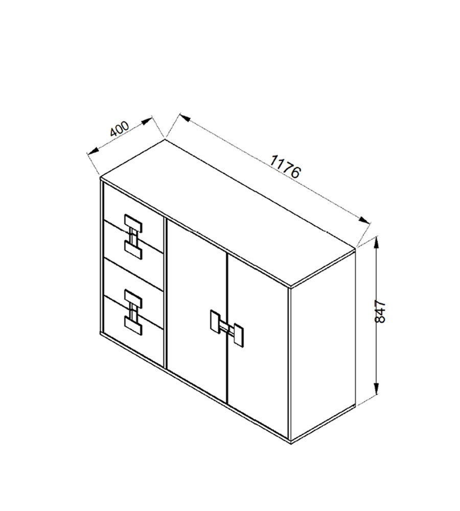 - Die Kommode hat Platz für vier Schubladen und drei Regale mit Türen geschlossen.