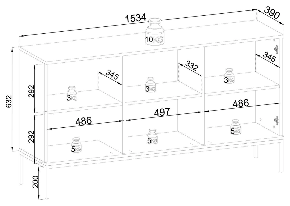 Hinter jeder Front verbirgt sich ein praktischer Einlegeboden , der Stauraum bietet und die Kommode somit nicht nur optisch ansprechend, sondern auch funktional macht. Zusätzlich ist die Ablage hinter der Glasfront mit einer LED-Beleuchtung ausgestattet .