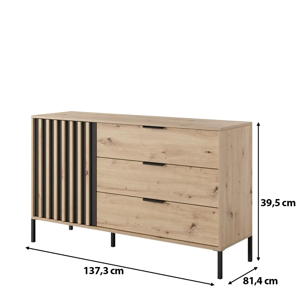 Auf der linken Seite der Türfront befindet sich ein dekoratives Element in Form von Lamellen aus MDF- Platten , das dem Möbel einen individuellen Charakter verleiht. Auf der rechten Seite bietet es drei geräumige Schubladen, die sich perfekt zur Aufbewahrung aller Arten von Gegenständen eignen. Hochwertige Vollauszüge mit Kugellagern gewährleisten ein sanftes und problemloses Öffnen der Schubladen und verleihen der Kommode ein luxuriöses Finish.