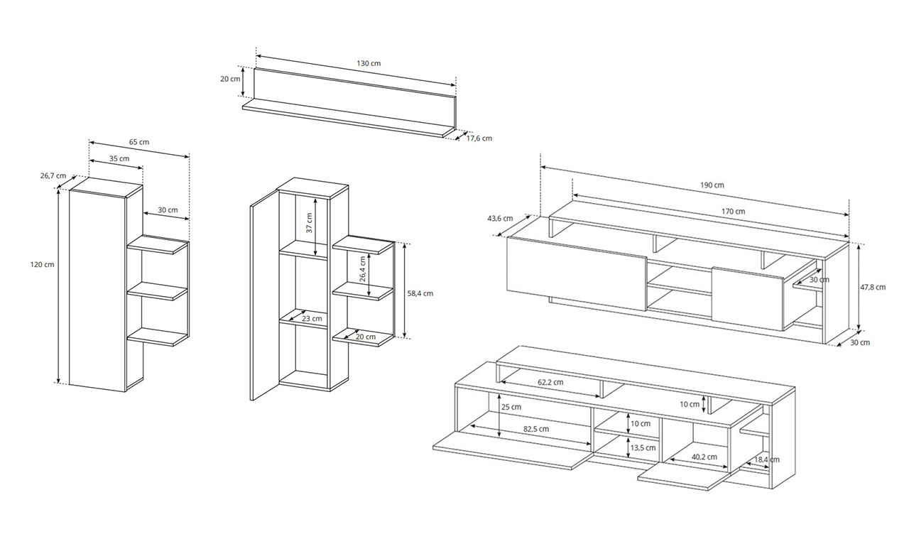 Eine Schrankwand, bestehend aus zwei weißen Schränken, einem großen TV-Schrank mit Auszug und Regalen, auf denen Sie Ihre Lieblingsbücher oder Dekorationen unterbringen können.
