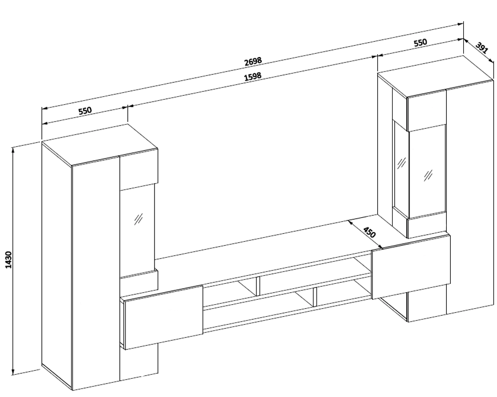 Möbel Wandschrank CAMBODE ist ein modernes und zeitloses Design, das ihn zu einer perfekten Wahl für zeitgenössische Wohnzimmer und Sitzungssäle macht. Die Schrankwand besteht aus zwei Vitrinen mit zwei Glasböden hinter dem Glas. Darunter befinden sich Ebenen, die sich dank ihrer Lage hinter dem vollen Teil der Tür perfekt für die Unterbringung von Gegenständen eignen, die wir vor dem Tageslicht verbergen wollen. Der RTV-Schrank hingegen verfügt über Türen auf der linken und rechten Seite und offene Ebenen in der Mitte, die sich perfekt für die Unterbringung von kleinen Dekorationen und Accessoires eignen. Außerdem haben die Glasböden der Vitrinen die Möglichkeit, eine Zusatzbeleuchtung anzubringen, die Sie unten im Abschnitt "EMPFOHLEN".