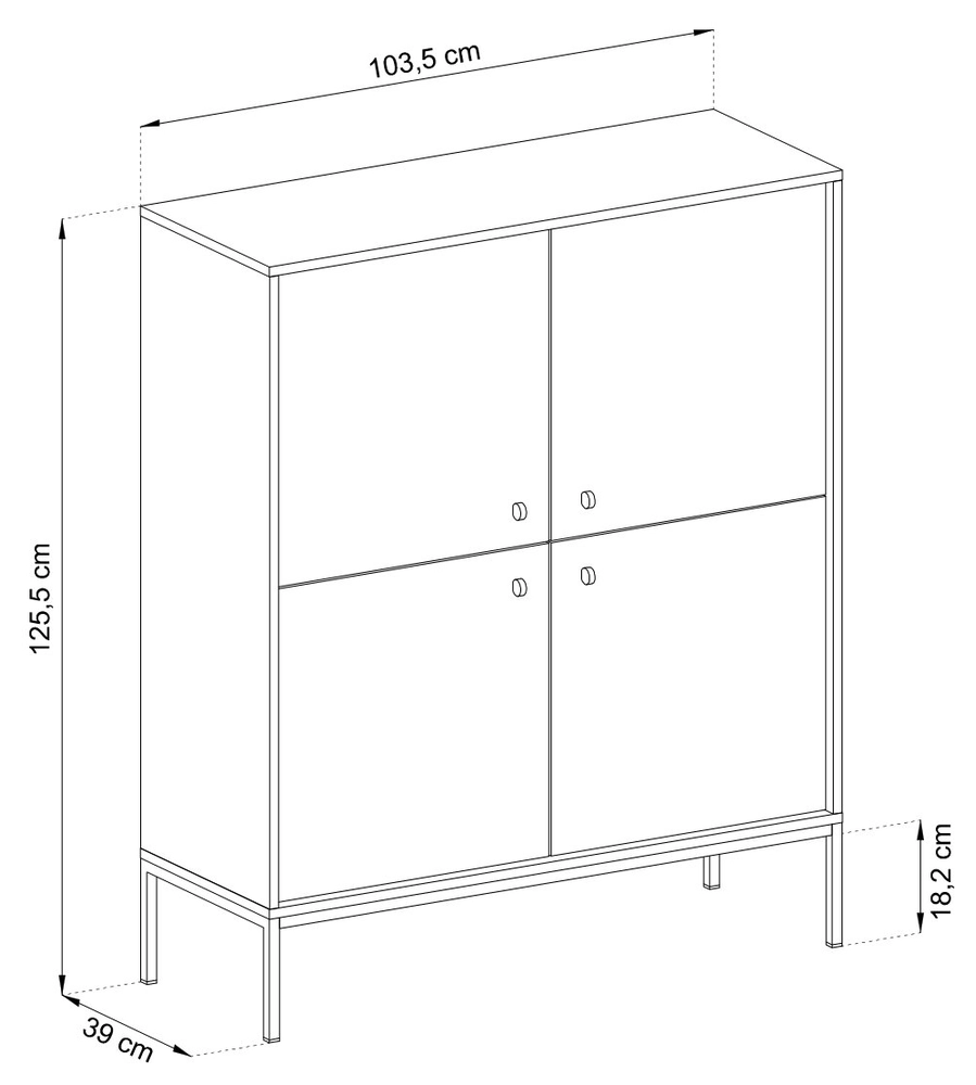 Die Kommode verfügt über vier Türen, die den Blick auf einen geräumigen Innenraum freigeben. Im Inneren befinden sich mehrere praktische Regale, die Ihnen die geordnete Aufbewahrung unterschiedlicher Gegenstände – von Büchern bis hin zu Dekorationen – ermöglichen.