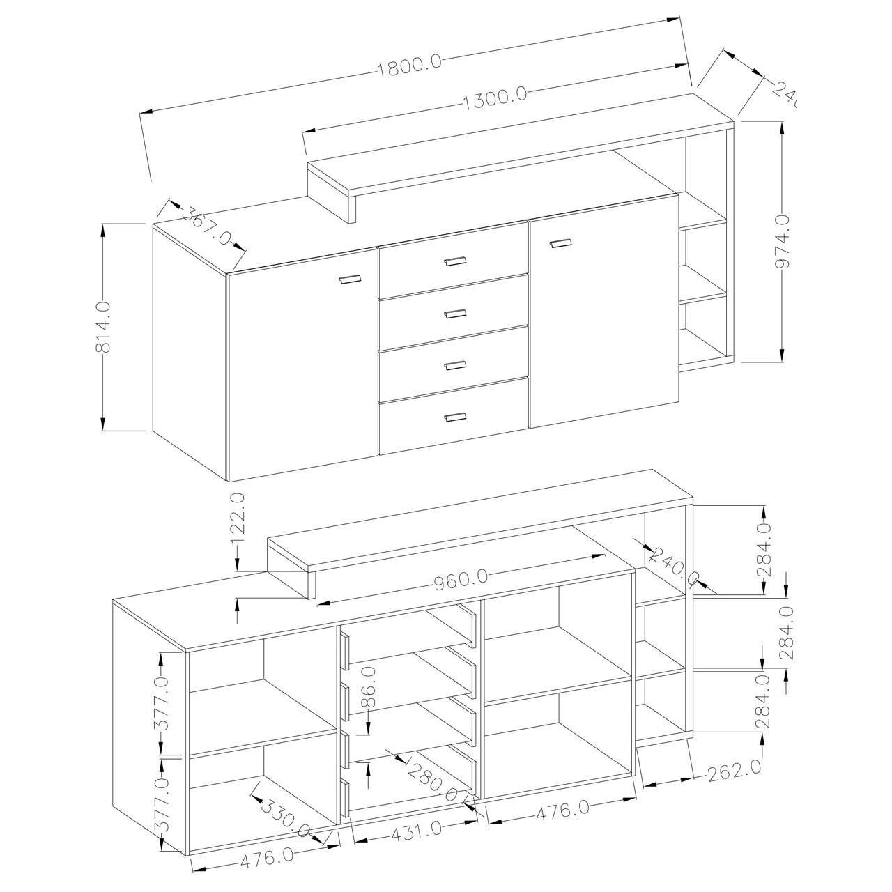 Moderne Kommode für das Wohnzimmer mit asymmetrischen Formen, ausgestattet mit zwei Paaren von Flügeltüren und vier Schubladen.