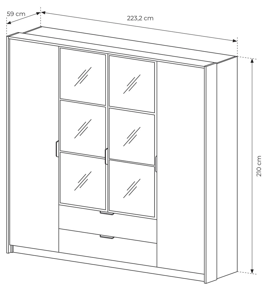 Der 220 cm breite viertürige Kleiderschrank bietet all Ihren Kleidungsstücken und Accessoires optimalen Platz und sein Innenleben wurde so gestaltet, dass der vorhandene Platz optimal ausgenutzt wird. Während die Reling und die Einlegeböden die Aufbewahrung diverser Garderobenartikel ermöglichen, eignen sich die zusätzlich eingebauten zwei Schubladen, ausgestattet mit Soft-Close-Kugellagerauszügen , ideal für Kleinteile oder Unterwäsche.