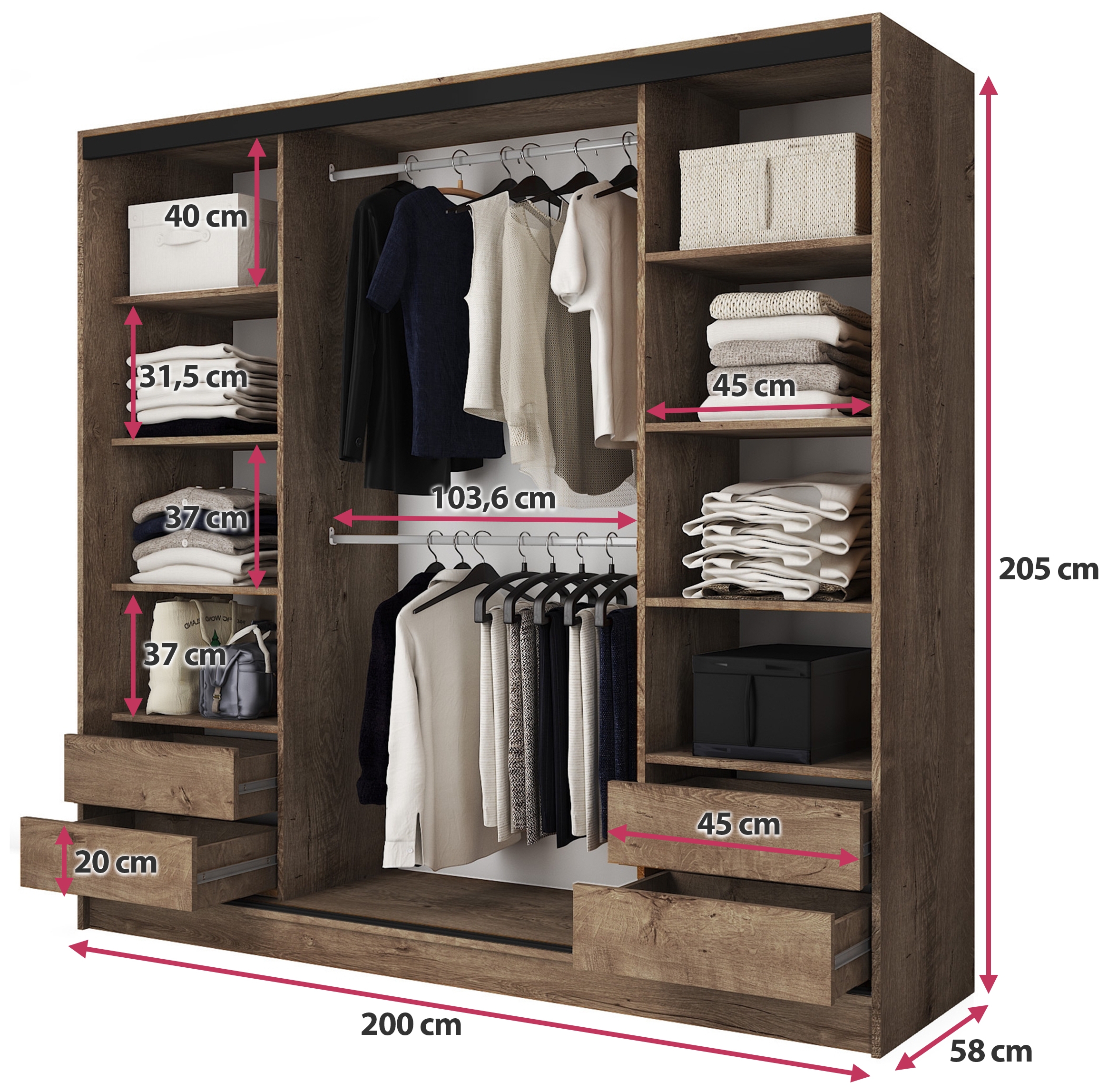 Der Kleiderschrank ist außerdem mit vier tiefen Schubladen auf kugelgelagerten Schienen ausgestattet , die ein sanftes Öffnen garantieren. Sie eignen sich perfekt für die Aufbewahrung kleinerer Gegenstände wie Unterwäsche oder Accessoires und helfen, Ordnung in Ihrem Kleiderschrank zu halten.