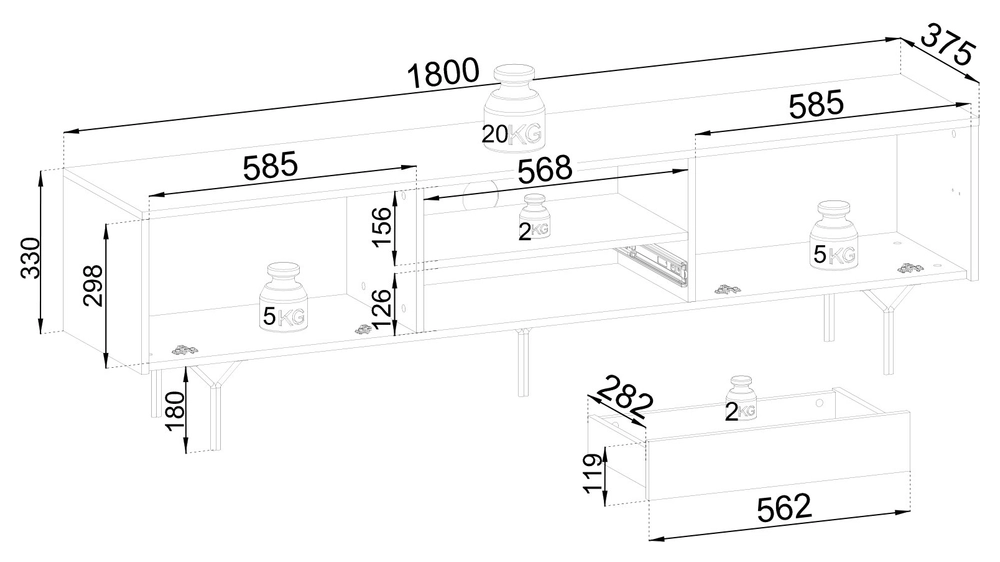 Dieser moderne Fernsehschrank ist 180 cm breit und bietet Ihnen mehr als genug Platz zur Aufbewahrung Ihres Fernseh- und Mediengeräts. Mit zwei Türen und einer praktischen Schublade eignet sich unser Fernsehschrank perfekt zur Aufbewahrung von Fernbedienungen, Filmen, Spielen und mehr.