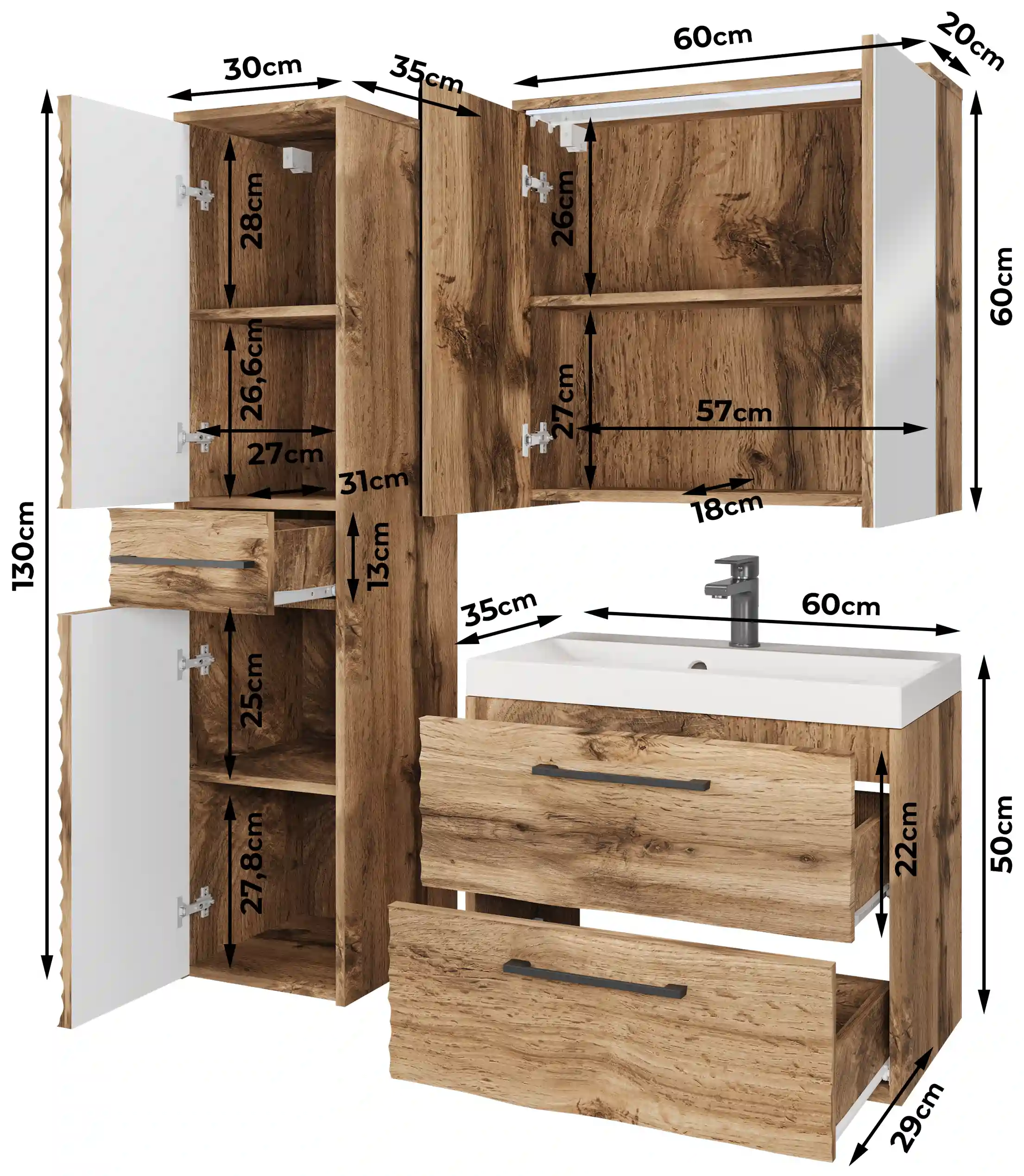 Alle Elemente der Kollektion sind aus hochwertigem MDF 18 mm dick, was ihre Haltbarkeit und Feuchtigkeitsbeständigkeit garantiert - unverzichtbare Eigenschaften in einem Badezimmer. Gefräste Vorderseiten verleihen Eleganz und unterstreichen den Charakter der Möbel. Die Kanten sind mit Furnier versehen ABS, die einen zusätzlichen Schutz und ein hochwertiges Finish bietet. Griffe aus Metall sie tragen nicht nur zur Schönheit bei, sondern sind auch äußerst langlebig und praktisch im Gebrauch. Dank des leisen Schließmechanismus, die Schranktüren schließen sanft und geräuschlos für zusätzlichen Komfort.