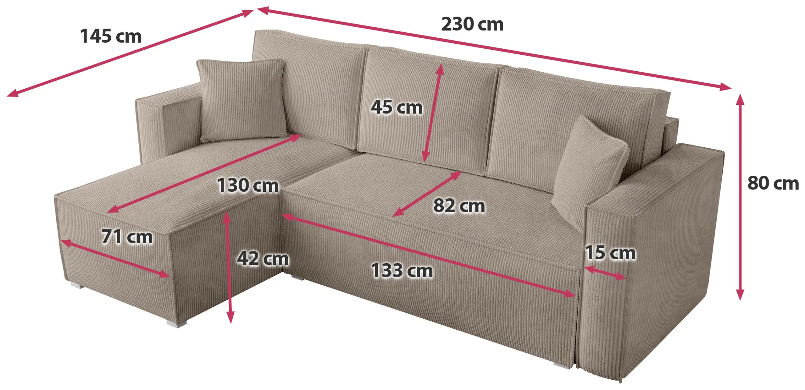 • Das ausziehbare Wohnzimmer-Ecksofa TOP ist mit dem Cordstoff Poso gepolstert. Das Ecksofa für das Wohnzimmer verfügt über eine Schlaffunktion, einen Bettcontainer und ein Kissenset. Die Beine des Ecksofas sind aus Kunststoff gefertigt. Sitz mit PUR-Schaum