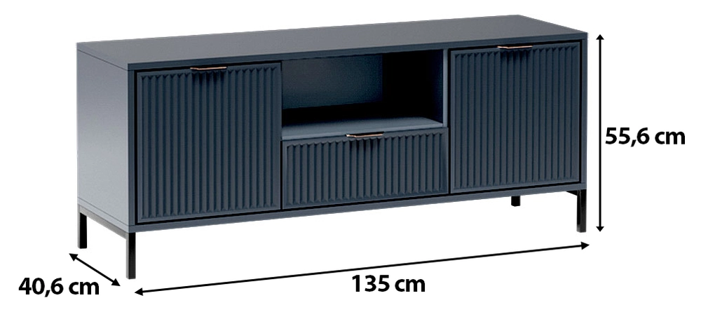 Dieser RTV-Schrank in der auffälligen Farbe Indigo ist die perfekte Wahl für Liebhaber des modernen Designs. Mit seinen eleganten Details wie den kupfernen Griffen und den schwarzen Metallbeinen ist er nicht nur ein funktionales Möbelstück, sondern auch ein klarer Stilakzent im Wohnzimmer.
