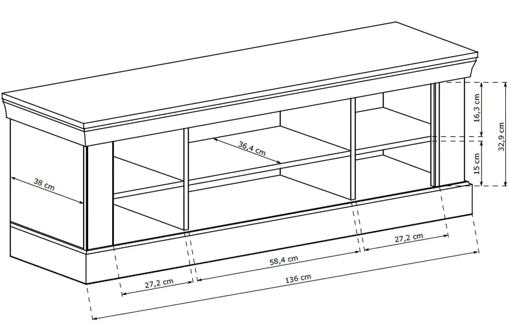 RTV-Schrank ADRE wurde in einem klassischen Stil hergestellt, der ihn zu einem sehr eleganten Vorschlag macht. An den Seiten befinden sich zwei Schränke mit je einem Regal, in dem Sie Ihr Zubehör unterbringen können, um ein wenig Privatsphäre zu gewinnen. Das offene Regal in der Mitte des Schranks eignet sich außerdem hervorragend für Dekorationen oder Erinnerungsstücke, die dem Raum eine eigene und einzigartige Note verleihen.