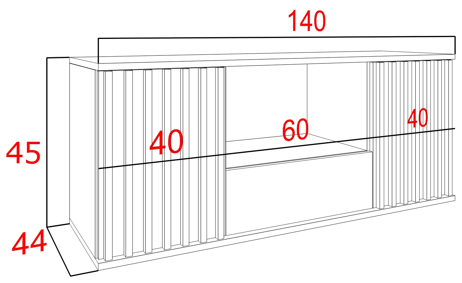 RTV-Schrank NELGARI hat 140 cm breit, mit Türen auf der linken und rechten Seite mit verstärkten Leisten mit Schrauben, die als Griffe dienen. Hinter jeder Tür befindet sich ein Regal zur Aufbewahrung von diversem Zubehör. Außerdem verfügt der Schrank in der Mitte über eine kugelgelagerte Schublade, in der Sie kleine Accessoires unterbringen können.