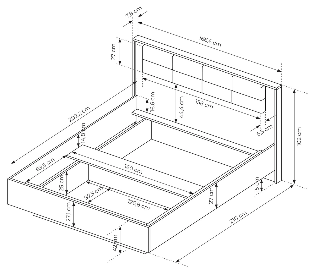 Zu den praktischen Elementen dieses Bettes gehört ein Bettkasten , der die einfache Aufbewahrung von Bettzeug und anderen Gegenständen ermöglicht. So halten Sie Ihr Schlafzimmer ordentlich und sparen Platz.
