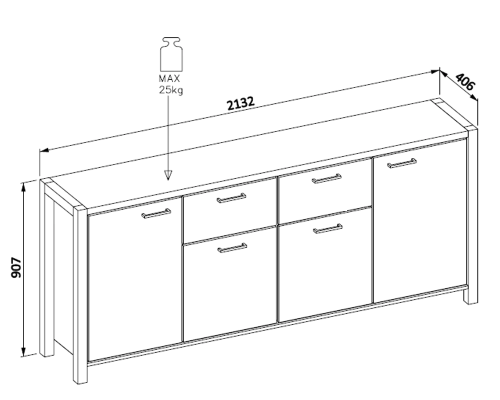 Kommode mit Schubladen ANGELINO hat ein modernes Design, das perfekt zu zeitgenössischen Wohnräumen passt. Die Kommode hat vier Türen mit einem Einlegeboden hinter jeder Tür und zwei Schubladen im mittleren oberen Teil mit kugelgelagerten Vollauszügen. Außerdem wurden die Griffe der Kommode aus Metall in matter und schwarzer Farbe gefertigt, was sie sehr solide macht und der Kommode Akzente im industriellen Stil verleiht.