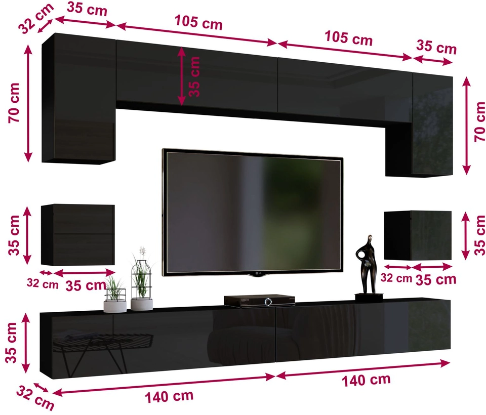 Holen Sie sich mit unserer modernen schwarzen Wohnwand die Quintessenz des anspruchsvollen Designs in Ihr Zuhause PREMIUM. Dieses ungewöhnliche, mit größter Sorgfalt hergestellte Möbelstück ist definitiv mehr als nur ein praktischer Stauraum. Eine klare Herausforderung an die Tradition, die zeigt, wie elegant und innovativ eine Möbeloberfläche sein kann.