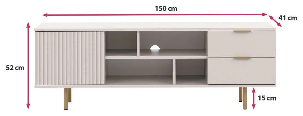 Die geriffelte Vorderseite des Schranks verleiht Charakter und Tiefe und behält gleichzeitig einen minimalistischen ästhetischen Ansatz bei. Die Türöffnung erfolgt über einen Push-to-Open -Mechanismus , so dass zum Öffnen des Schrankes nur ein Druck genügt. Zwei geräumige Schubladen sind mit einem geräuschlosen Schließsystem ausgestattet und gewährleisten so eine Nutzung ohne unnötigen Lärm. Offene Regale bieten Platz und bequemen Zugriff auf Decoder, Spielekonsole oder andere Multimediageräte.
