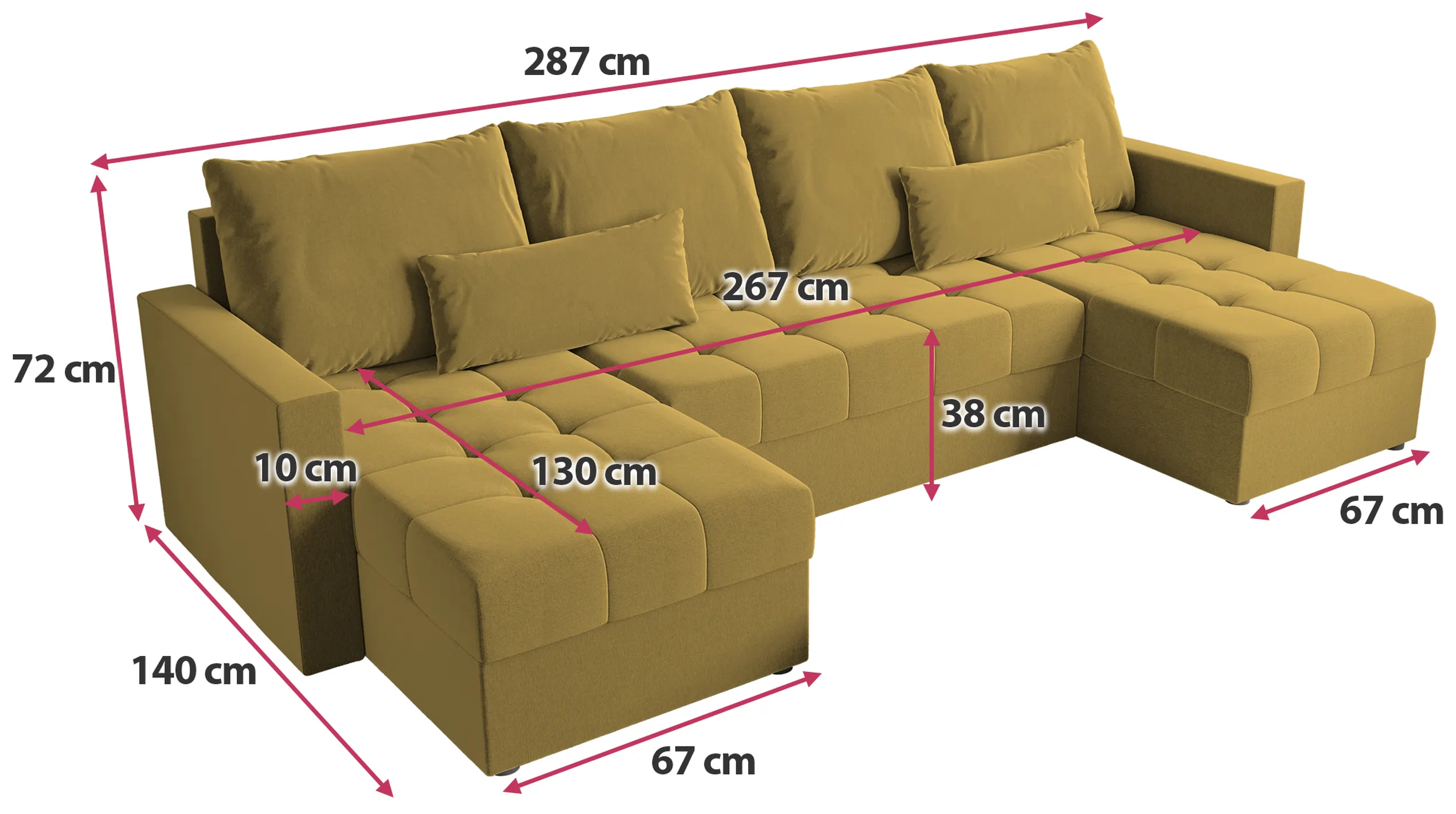 Verleihen Sie Ihrem Wohnzimmer mit dem modernen U-förmigen Ecksofa HOT eine neue Dimension der Funktionalität . Es passt perfekt in größere Wohnzimmer und bietet einen komfortablen Ort zum Entspannen für die ganze Familie. Dank der Schlaffunktion mit den Maßen 120x267 cm lässt sich dieses Ecksofa ganz einfach in ein bequemes Bett verwandeln, ideal für den Alltag oder als zusätzliche Schlafgelegenheit für Gäste.