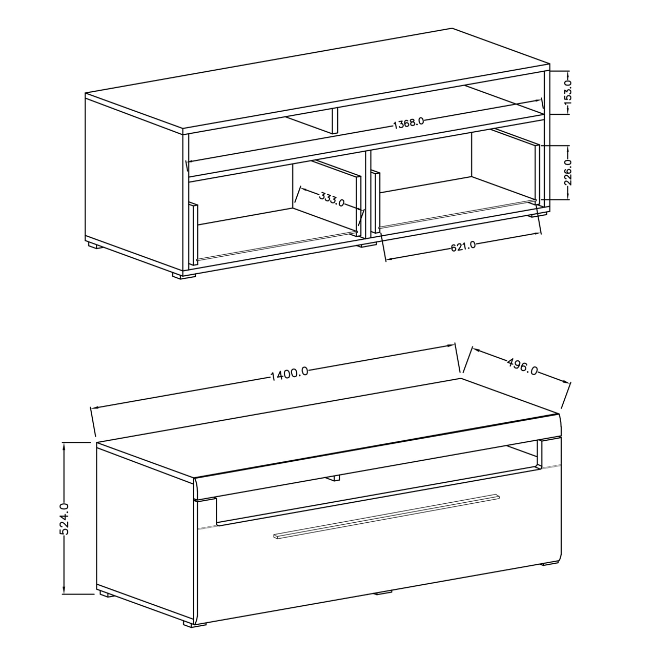 Geräumiger rtv-Schrank mit Doppelschublade und Einlegeböden, 140 cm breit.