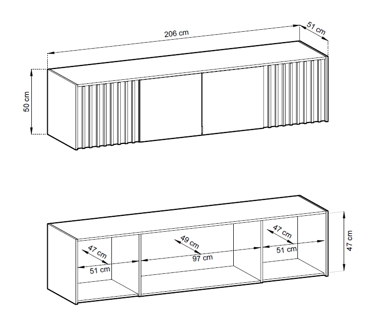 Lernen Sie die Erweiterung mit einer beeindruckenden Breite von 206 cm kennen, die Funktionalität mit modernem Design verbindet. Vier Türen, von denen die äußerste mit auffälligen Lamellen verziert ist, bilden ein Möbelstück, das den aktuellen Designtrends entspricht und gleichzeitig eine hervorragende Raumorganisation bietet.