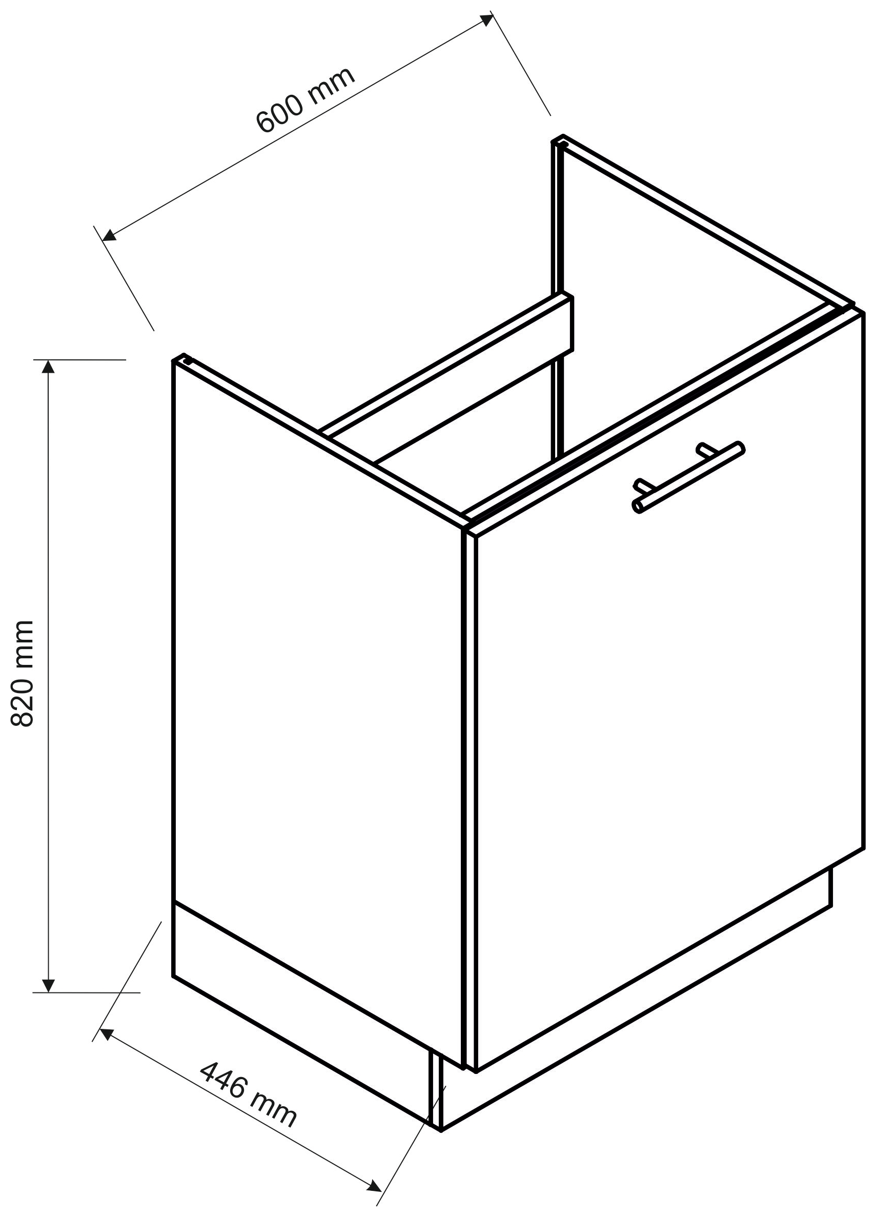 • Der BRIT Küchenschrank ist mit einer Tür ausgestattet, hinter der Sie einen Korb und Reinigungsmittel unterbringen können. Der Küchenschrank hat eine Front aus MDF-Platte und Scharniere mit Soft-Close-Funktion. Zudem sind die verchromten Griffe aus Metall
