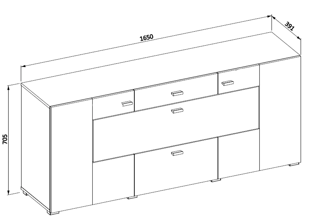 Kabinett CAMBODE ist ein modernes Design, das sich perfekt in zeitgenössische Wohnräume einfügt und diese elegant und einzigartig macht. Die Kommode hat rechts und links Türen mit je einem Einlegeboden hinter den Türen und in der Mitte zwei geräumige Schubladen auf Rollenauszügen. Außerdem befindet sich zwischen den Schubladen eine Flügeltür, hinter der diverses Zubehör untergebracht werden kann.