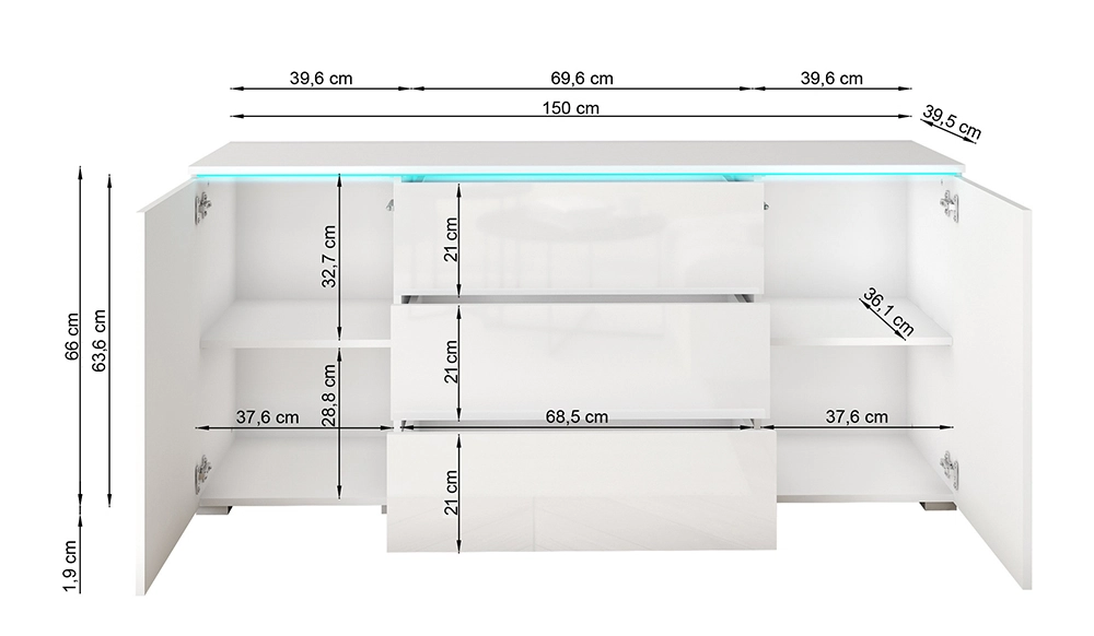 Moderne Kommode VELLORE ideal für ein kleines Wohnzimmer, Schlafzimmer oder Büro. Kommode mit Schubladen auf zuverlässigen Rollenbahnen laufend, bieten sie reichlich Stauraum, der in fast jeder Wohnung Mangelware ist. An den Außenseiten hat die Kommode je einen Einlegeboden aus Schichtstoffplatte. Die weiße Kommode erfrischt das Interieur, in dem sie aufgestellt wird, zusätzlich zu glänzende Fronten sie optisch vergrößern. Eine interessante Option ist die Möglichkeit, die Oberseite zu beleuchten dieser weißen Kommode mit LED-Beleuchtung in unserem Angebot.