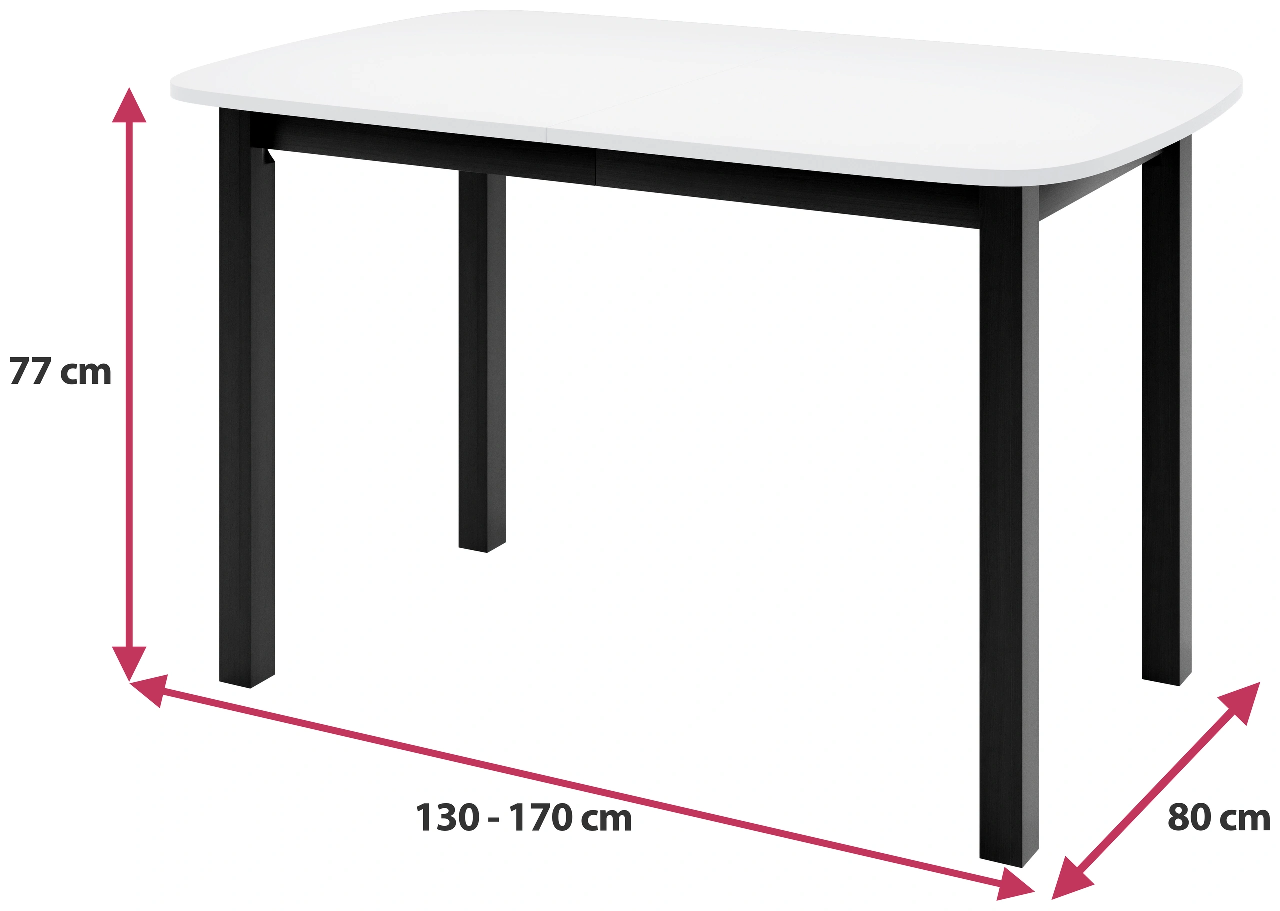 • Eleganter weißer DARK-Esstisch. Die Platte ist aus 18 mm laminierter Platte und die Beine sind aus schwarzem Buchenholz gefertigt. Tisch mit den Maßen 80x130 cm, ausgestattet mit einem zusätzlichen Einsatz, um die Maße auf 80x170 cm zu erhöhen.