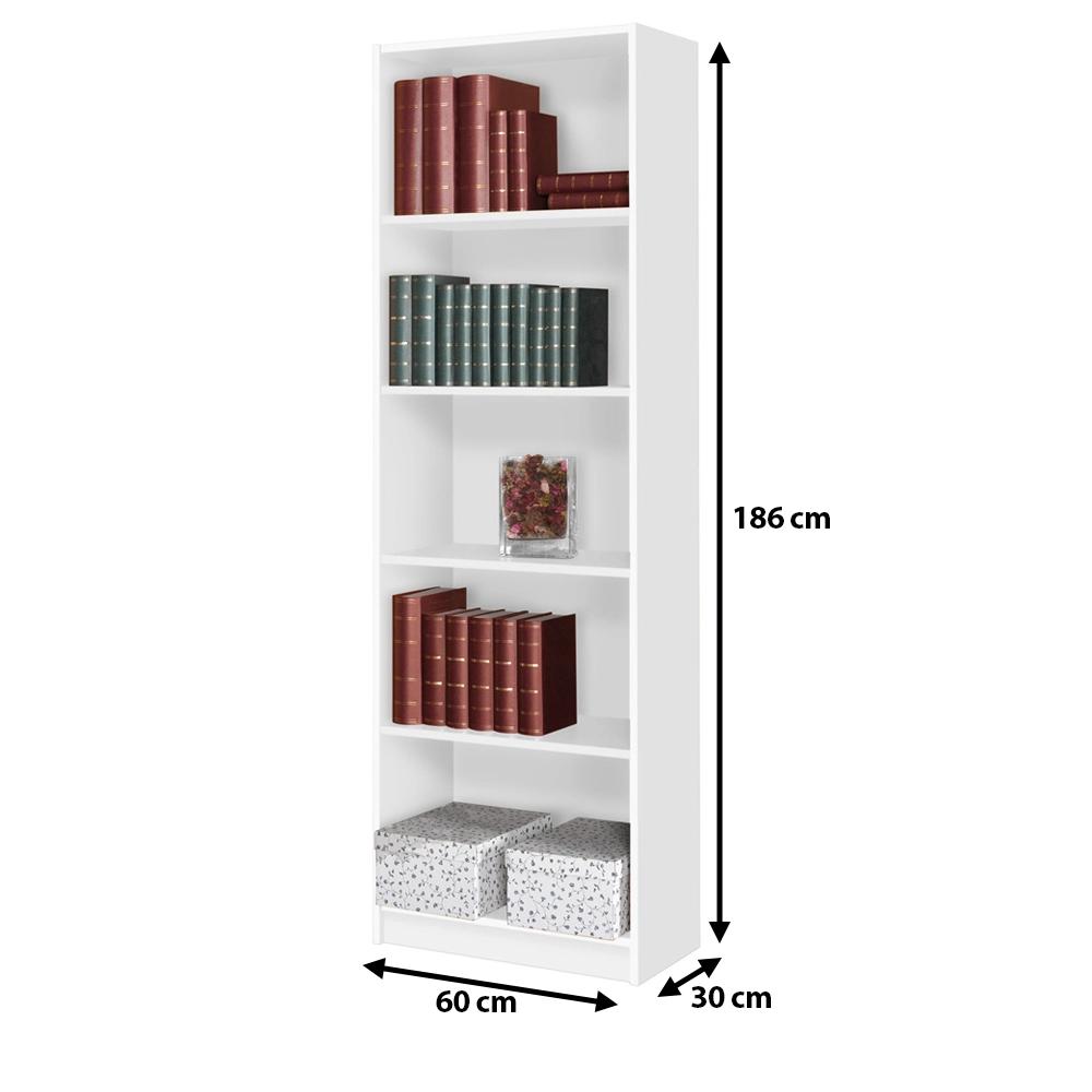 Das weiße moderne Bücherregal hat 60 cm breit, ideal für kleine und mittelgroße Räume geeignet und bietet eine optimale Raumausnutzung. Seine Höhe ist angemessen und schafft ein perfektes Gleichgewicht zwischen Funktion und Form.