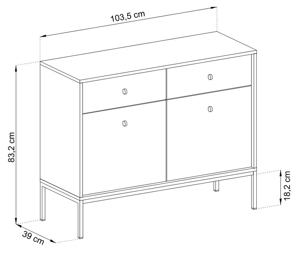 Die Kommode verfügt über zwei Türen, die einen geräumigen Innenraum freigeben, der sich ideal zur Aufbewahrung unterschiedlichster Gegenstände eignet. Über der Tür sind zwei praktische Schubladen angebracht, welche den Organisationsspielraum der Kommode zusätzlich erhöhen. Dadurch bleibt viel Platz zum Verstauen von großen und kleinen Gegenständen.