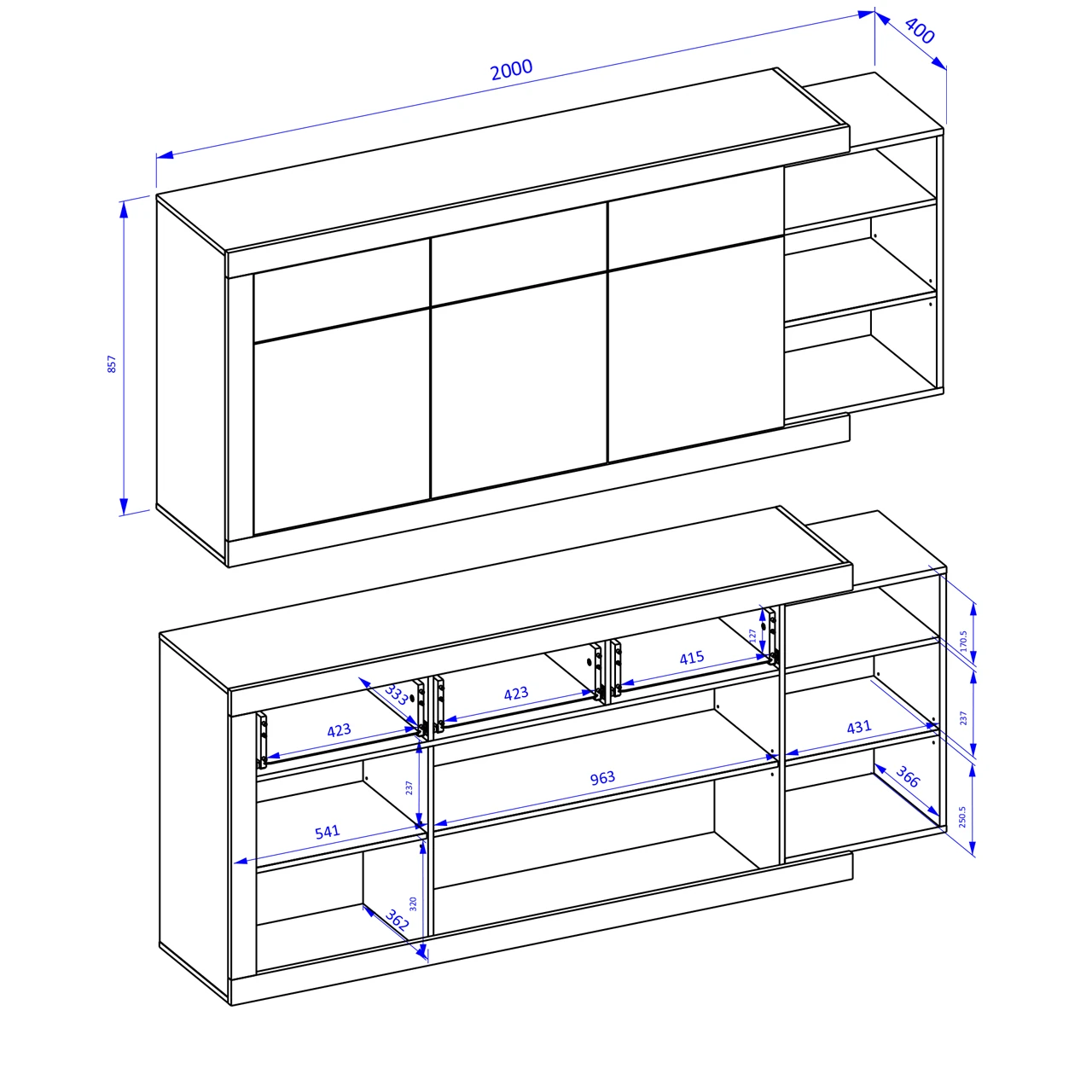 Zimmerkommode 200cm breit, ausgestattet mit Flügeltüren, Schubladen und offenen Regalen.