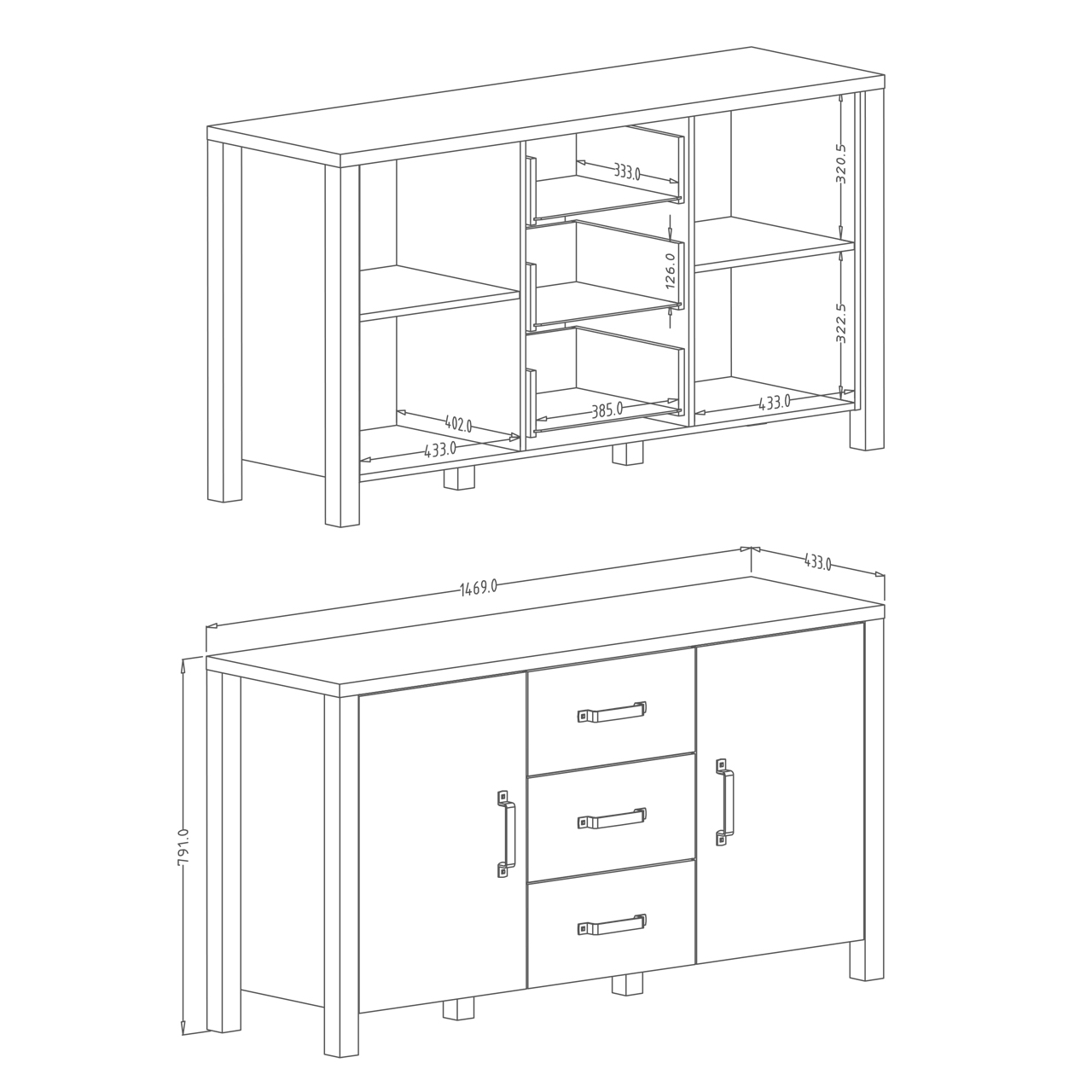 Moderne 147 cm breite Wohnzimmerkommode im Industriestil mit Flügeltüren und Schubladen.