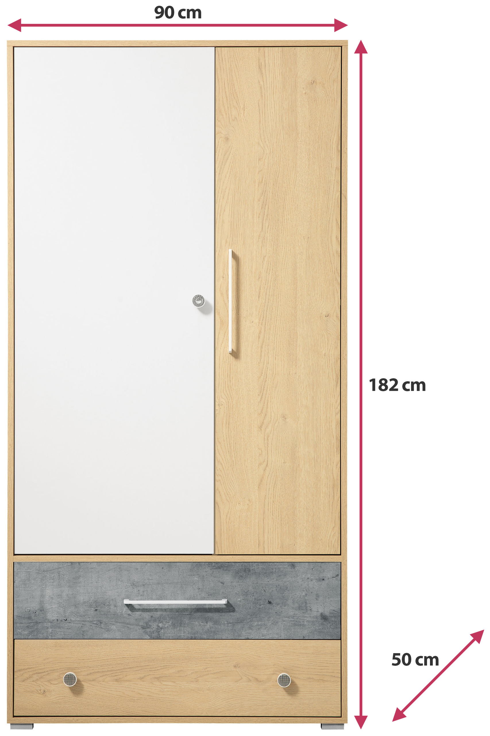 Die Farben, eine Kombination aus den drei Farbtönen Schwammeiche, Luxweiß und Beton, verleihen dem Kleiderschrank einen einzigartigen Charakter, der perfekt in moderne, jugendliche Inneneinrichtungen passt.