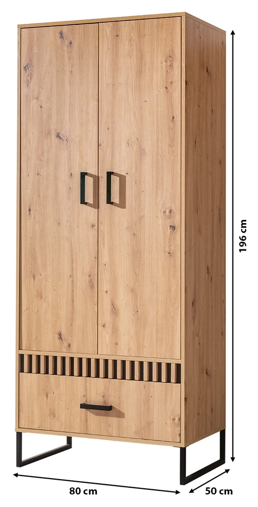 Präsentation eines modernen, zweitürigen Kleiderschranks LIVORNO, eleganz und Zweckmäßigkeit verbinden. Unsere Garderobe passt zu jeder modernen Einrichtung und besticht durch ihren ungezwungenen Stil und ihren raffinierten Geschmack.
