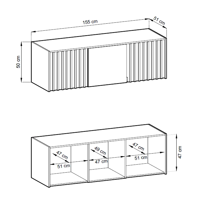 Erweitern Sie Ihre Aufbewahrungsmöglichkeiten mit der 155 cm breiten Erweiterung, die Funktionalität mit modernem Design verbindet. Drei praktische Türen, von denen eine mit auffälligen Lamellen verziert ist, machen dieses Möbelstück nicht nur leicht zu organisieren, sondern verleihen der Einrichtung auch einen einzigartigen Charakter.