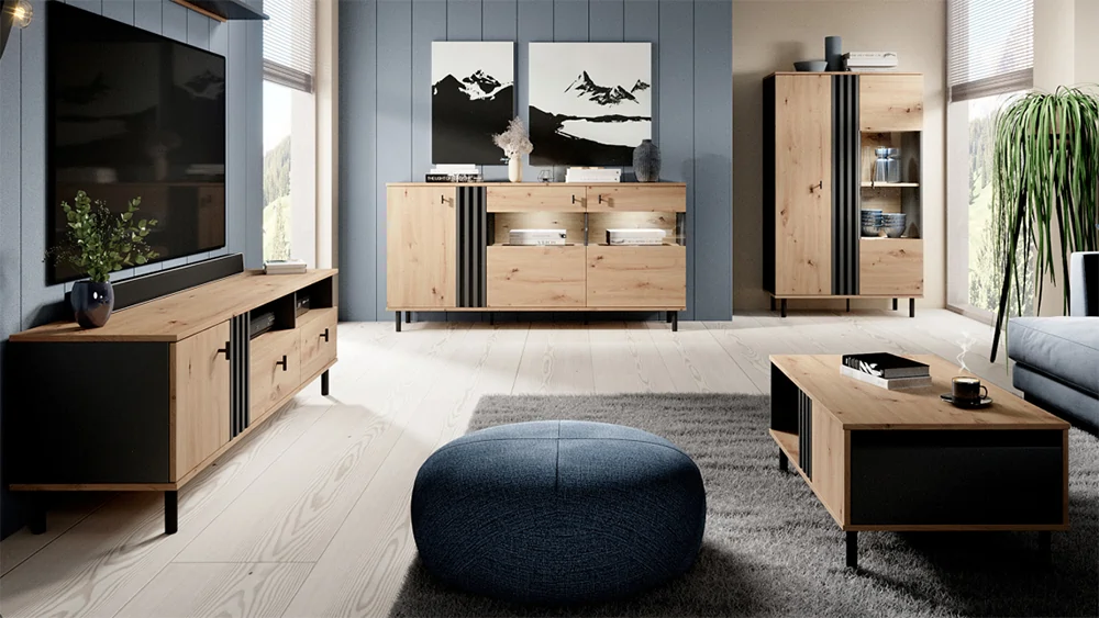 Zeitloses, handwerklich gefertigtes Eichenholz kombiniert mit schwarzen Akzenten wie metallbeine, oder Griffe, um diesen schlichten Stücken eine besonders gemütliche Note zu verleihen. Sie werden sich wohlfühlen in einem Interieur, das mit MADIS Kommoden, Vitrinen oder RTV-Schränken ausgestattet ist.
