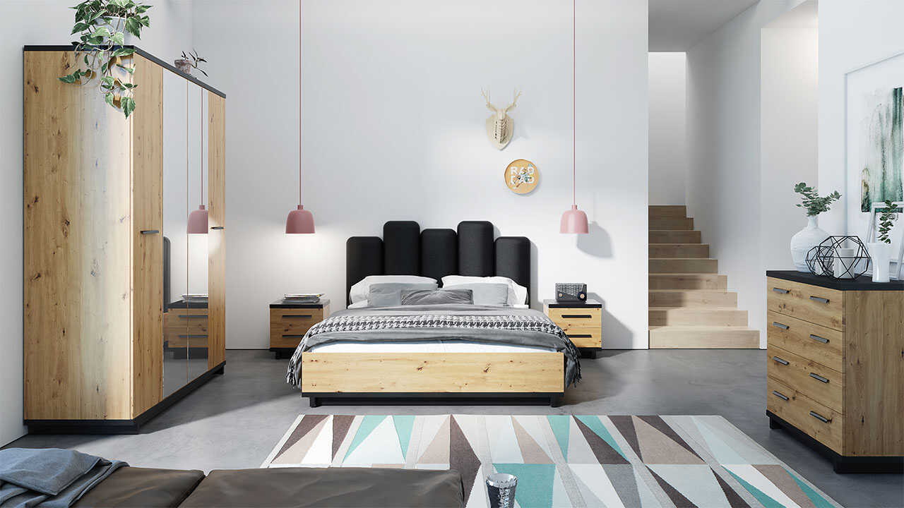Kunsthandwerkliche Eiche kombiniert mit schwarzen Oberteilen i schwarze Griffe passt in rustikale Innenräume. Wählen Sie aus der verfügbaren Kollektion von Systemmöbeln die aus, die Sie am meisten brauchen und stellen Sie eine eine Wohn- oder Schlafzimmereinrichtung.