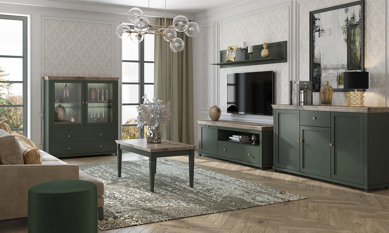 ( Anzahl der Produkte: 20 )IVORIA ist eine Kollektion von klassischen Möbeln mit einem originellen Design. Erhältlich in Flaschengrün in Kombination mit Lefkas-Eiche, passt es perfekt zu den heutigen Trends. Für diejenigen, die ein eher provenzalisches Dekor bevorzugen, sind die Möbel in der Farbe Abisko Esche erhältlich, einem hellen Farbton mit einer charakteristischen grauen Maserung. Die Serie IVORIA umfasst Vitrinen, Kommoden und ein Hängeregal, ergänzt durch einen Couchtisch und einen Klapptisch. Fräsungen in den Deckeln und Fronten oder Messingknöpfe unterstreichen den klassischen Stil dieser Kollektion zusätzlich. Mit den verfügbaren Elementen können Sie ein klassisches Wohnzimmer, ein Esszimmer oder einen Salon einrichten. Die Möbel werden nach den höchsten technologischen und qualitativen Standards hergestellt, was ihre Langlebigkeit garantiert.